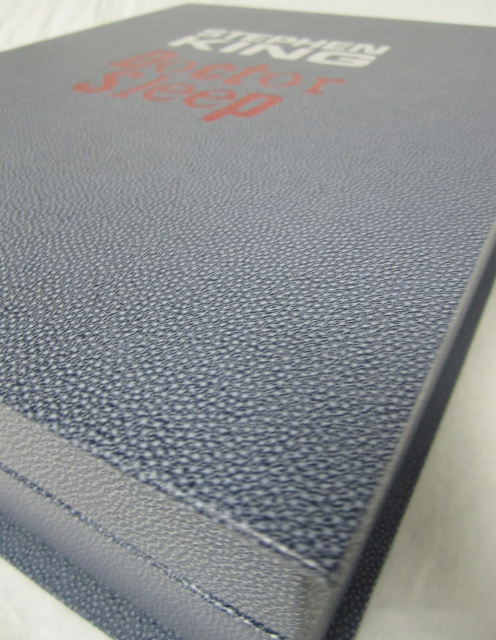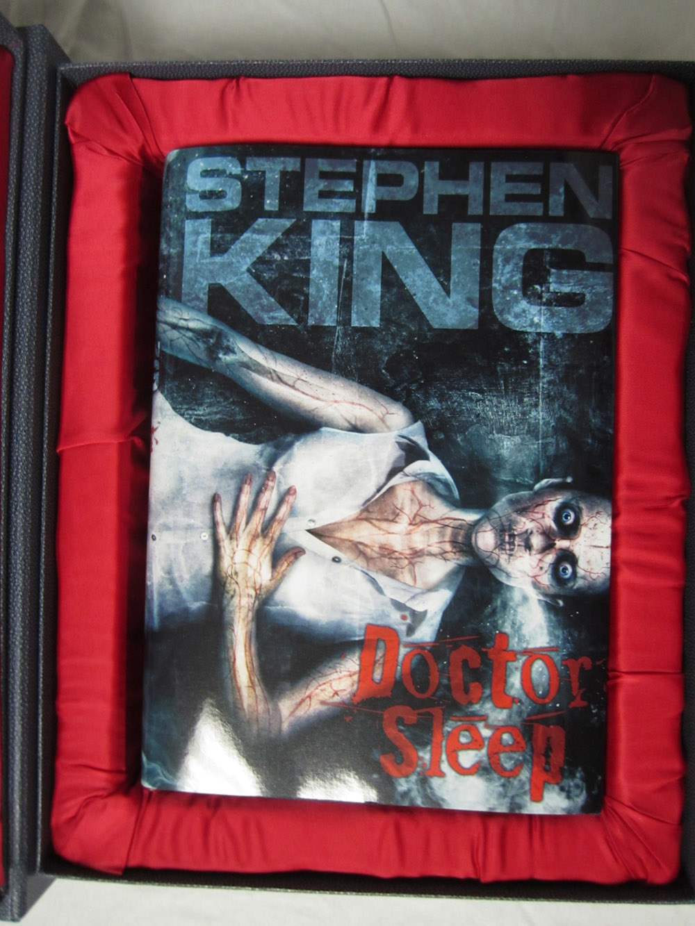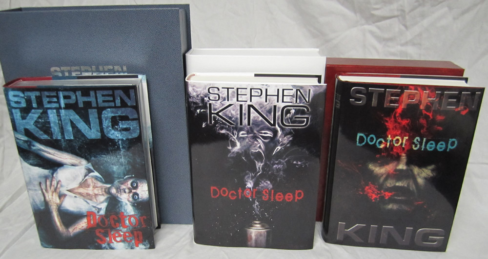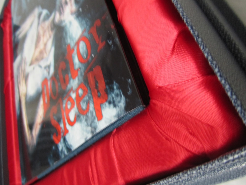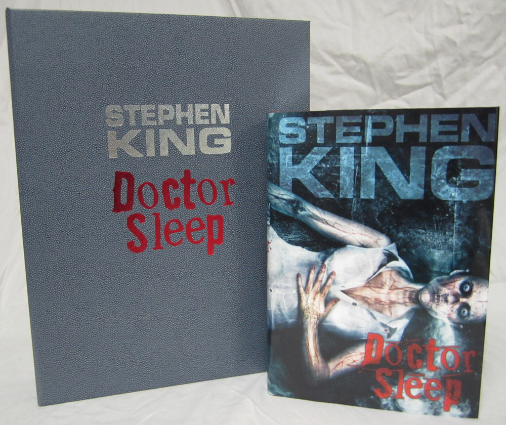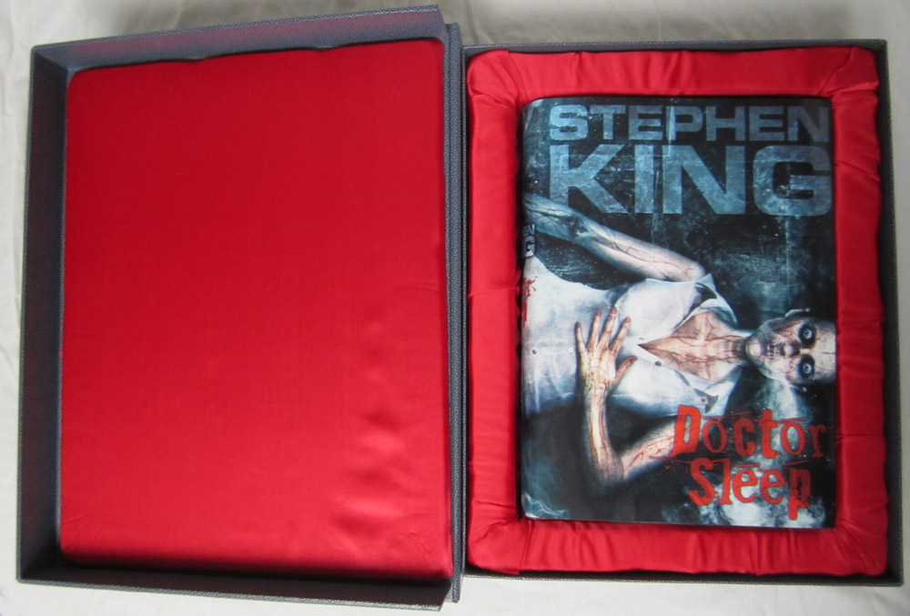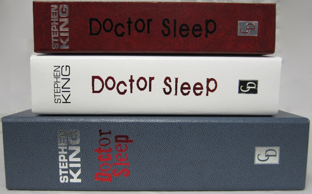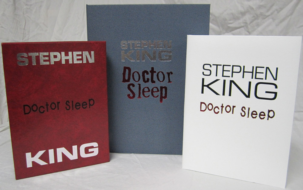 The Deluxe Lettered Edition of Doctor Sleep by Stephen King is limited to 52 signed and lettered copies and should be finished at our box maker in April. We received the approval case today and thought our collectors might like a sneak peek. I’ve included the Limited Edition (white traycase) and the Gift Edition (red slipcase) in a few of the shots for reference.