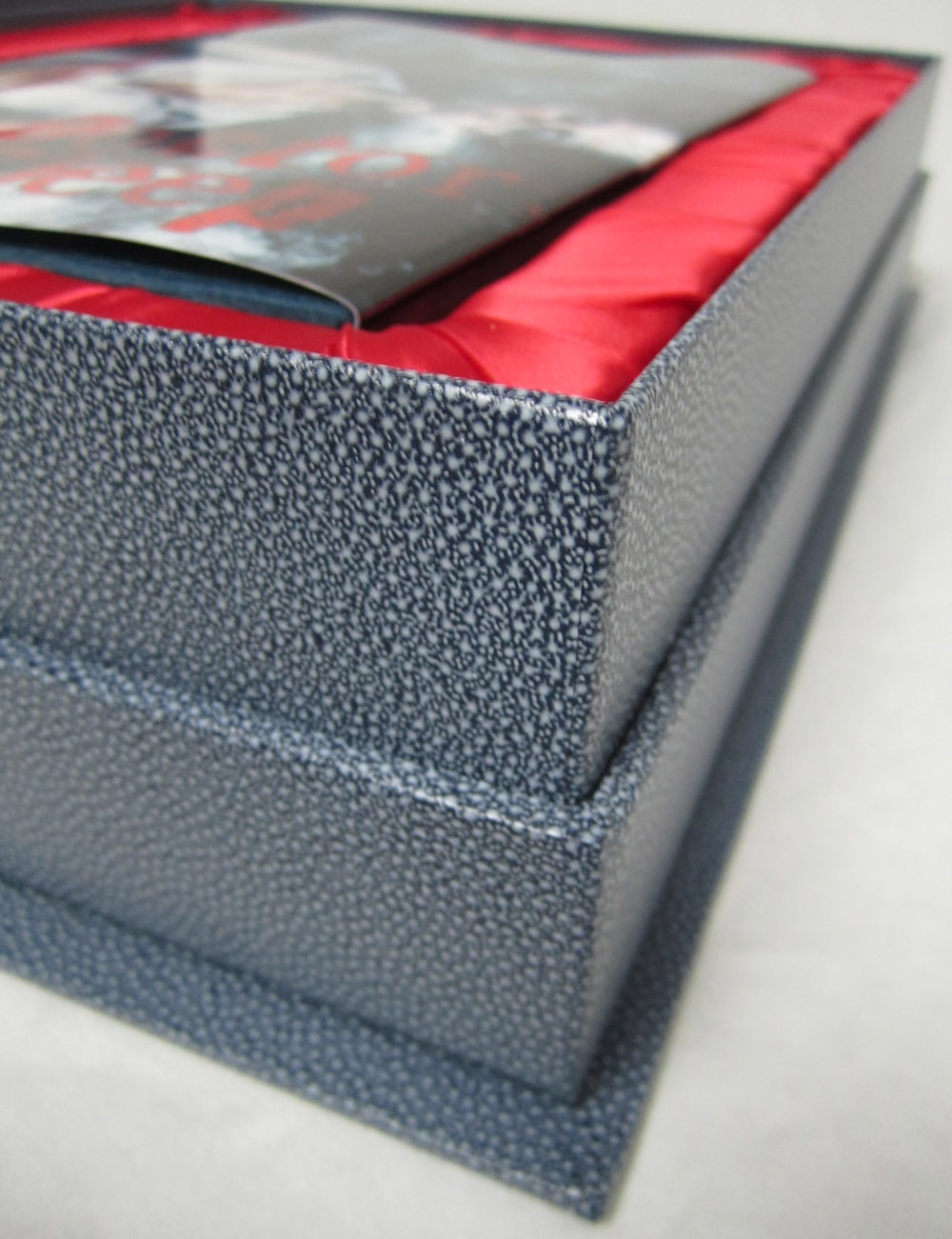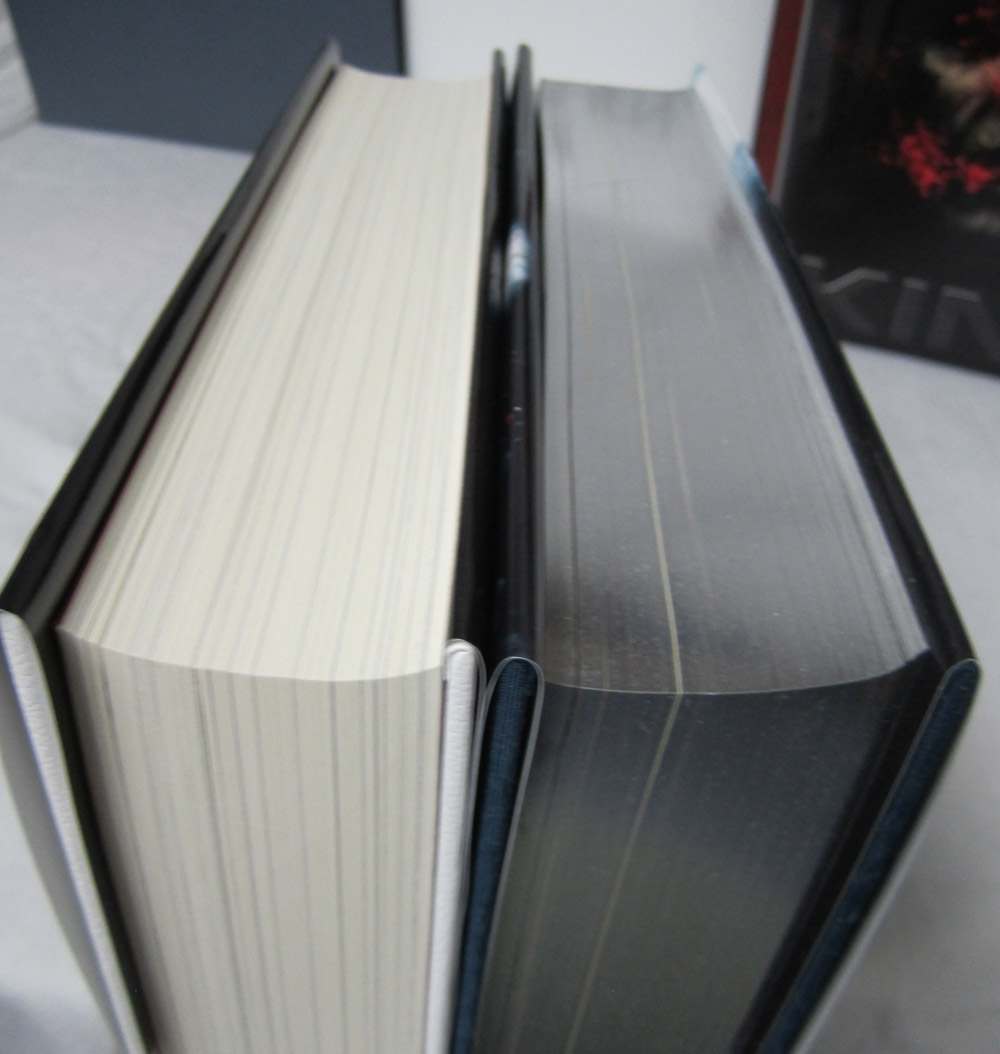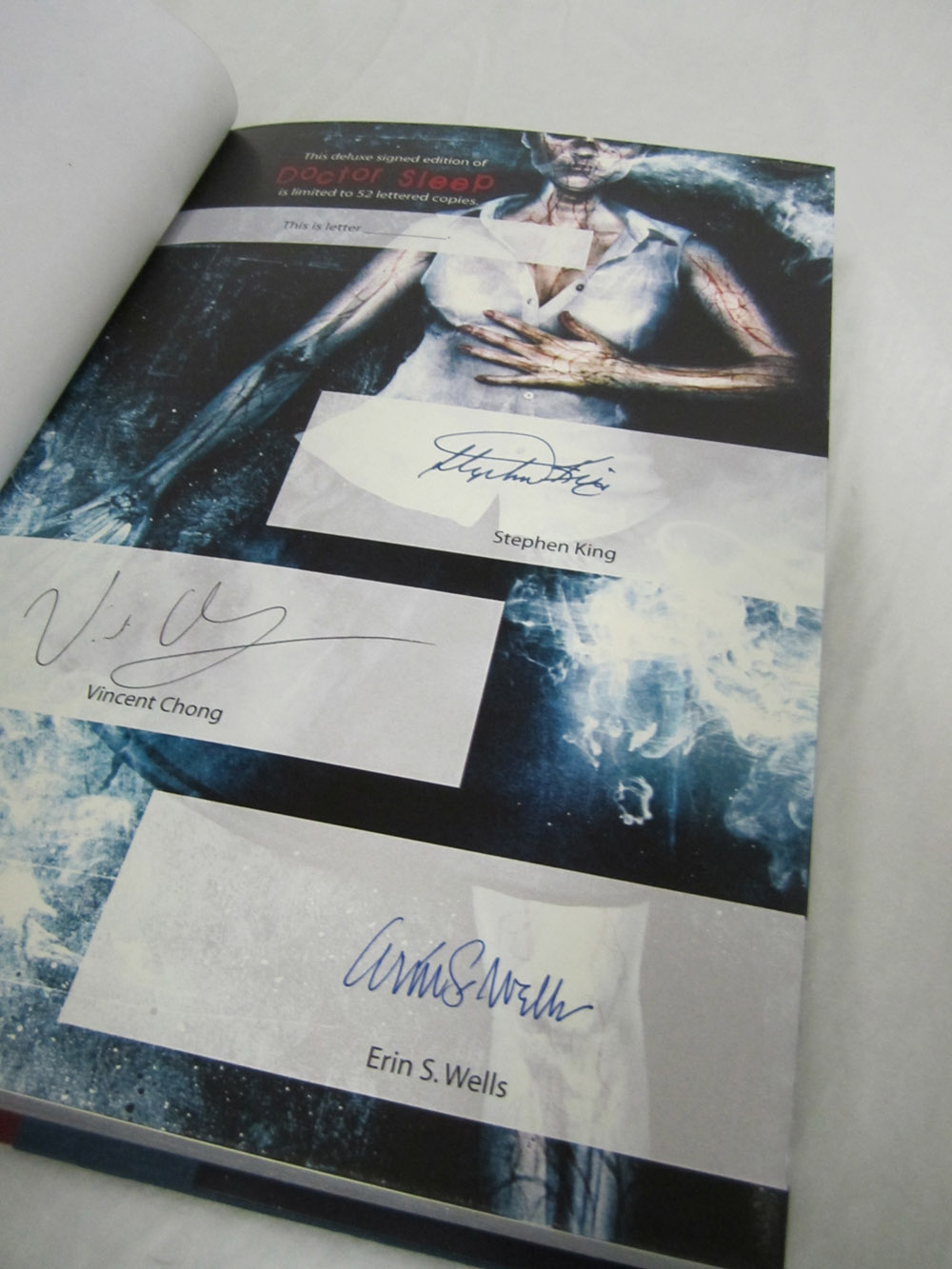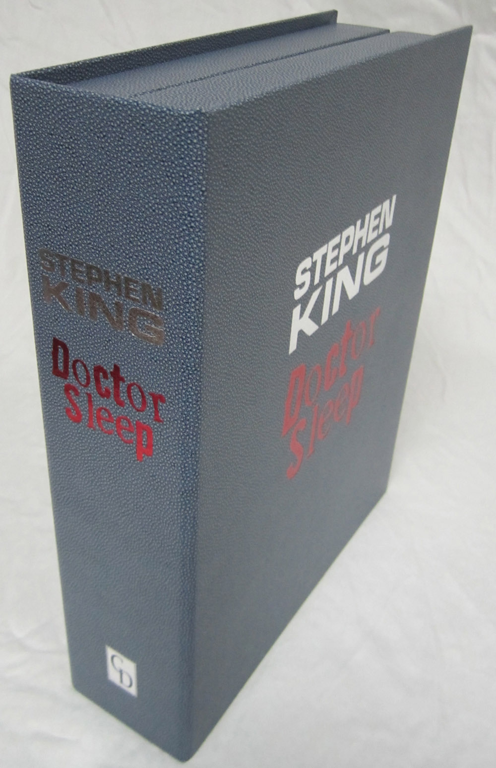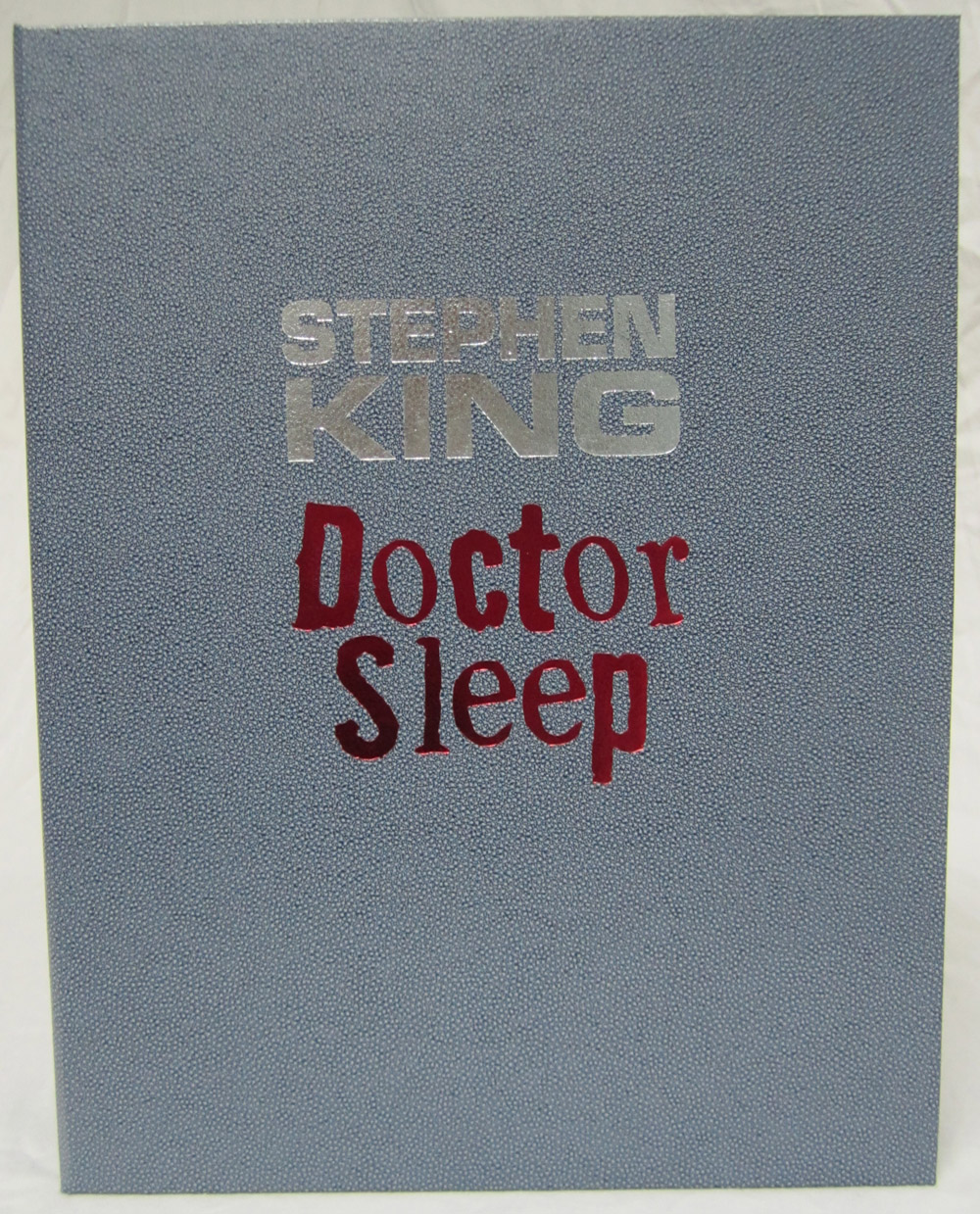 The Deluxe Lettered Edition of Doctor Sleep by Stephen King is limited to 52 signed and lettered copies and should be finished at our box maker in April. We received the approval case today and thought our collectors might like a sneak peek. I’ve included the Limited Edition (white traycase) and the Gift Edition (red slipcase) in a few of the shots for reference.