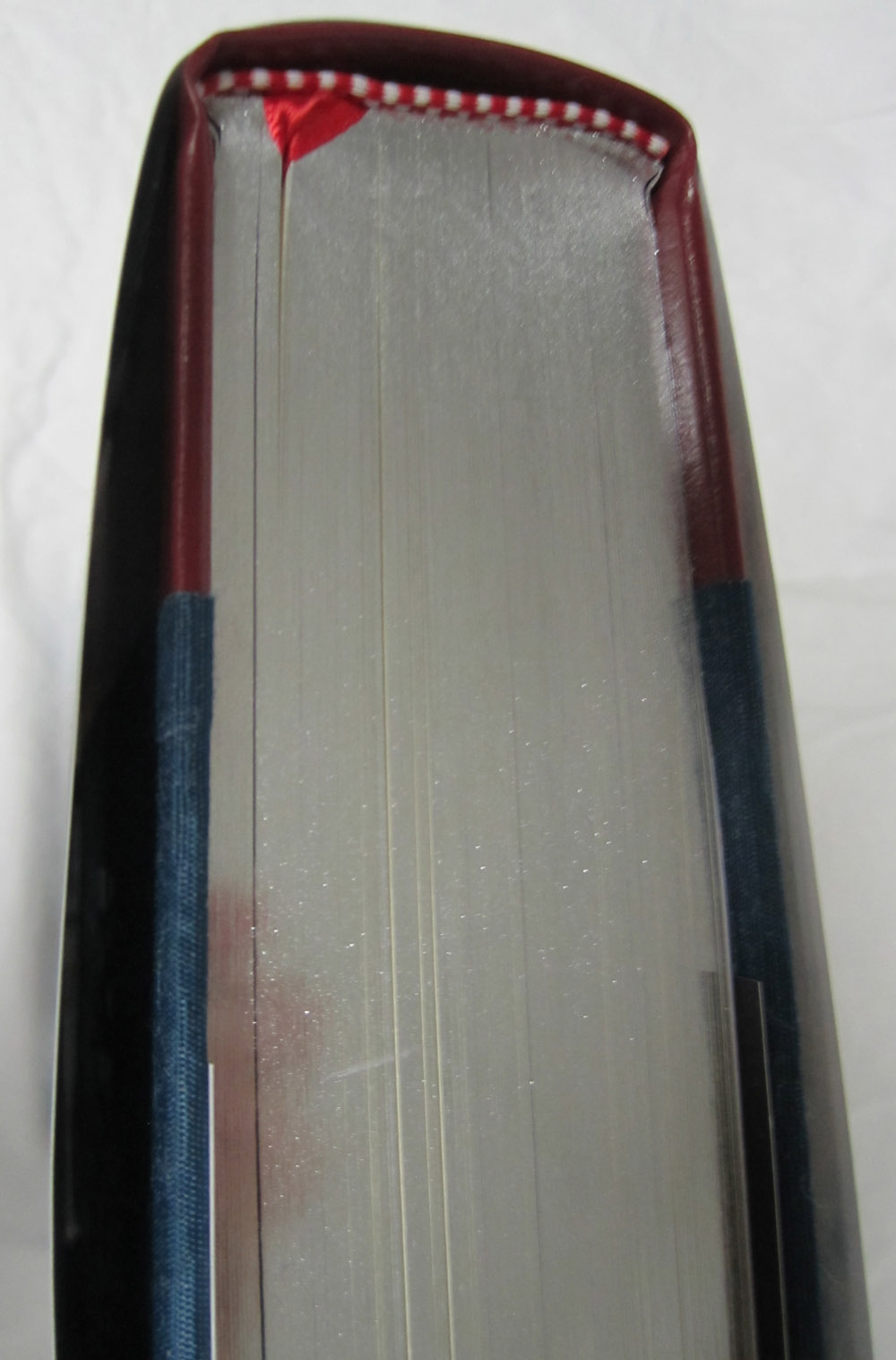 * cotton hinge cloth, sewn headbands, and red silk ribbon page marker